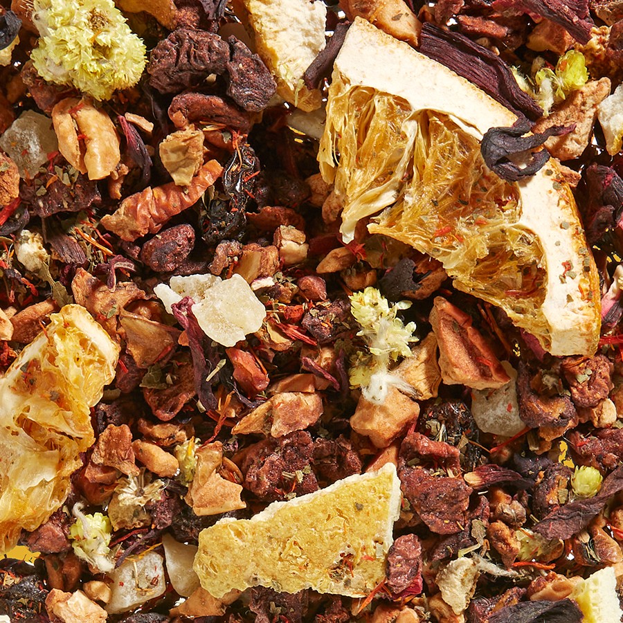 De blend is niet alleen een smaakbeleving, maar ook een lust voor het oog dankzij ingrediënten zoals hibiscusbloesem, saffloer en sinaasappelschijfjes, die doen denken aan een warme zomerzonsondergang.